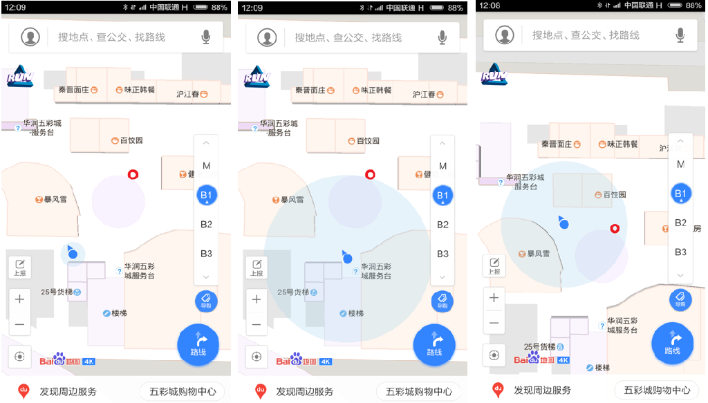 然而,后來一切進展的并不順利。到現(xiàn)在2016年下半年已經有幾年時間過去了,室內定位應用似乎并沒有走進大家的生活。手機地圖APP在大型購物中心里還是不好用,人們在停車場依然要費勁才能找到自己的車。近日,筆者在北京IT公司聚集地附近的清河華潤五彩城購物中心實地測試室內定位的效果。用Android手機打開百度地圖APP進行室內定位測試,下圖是筆者在同一點(紅圈)進行三次定位得到的結果(藍圈范圍),可以看到定位結果很不穩(wěn)定,甚至時常會把我定位到購物中心的外面。換成高德地圖(被阿里收購)、騰訊地圖,換成其它購物中心,效果都類似。用IOS手機則定位效果更差(原因后文會講)。定位不穩(wěn)定、結果不可信,造成室內定位應用不能進入大眾生活,相關生態(tài)也無法建立。筆者覺得這里恰好隱藏著很大的機會。